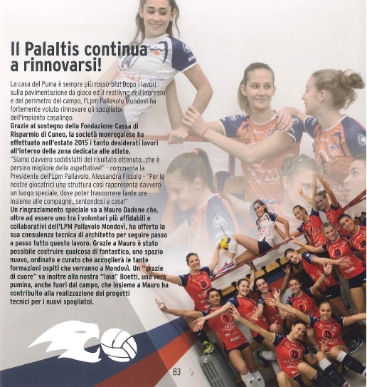 Trattasi degli spogliatoi dell'Itis nel Comune di Mondovì (CN), attuale palestra della squadra di pallavolo femminile che milita nel campionato nazionale di B1 (LPM PAVVALOLO MONDOVI'), sono stati rifatti tutti gli impianti, i pavimenti, i rivestimenti e gli infissi interni con inserti del logo societario nel pavimento e nel rivestimento delle docce e con tinteggiature che riprendono i colori della società.