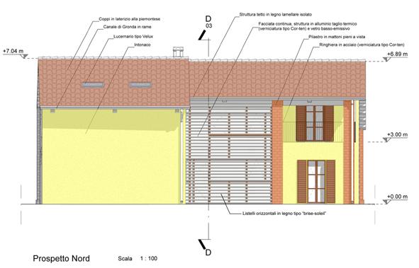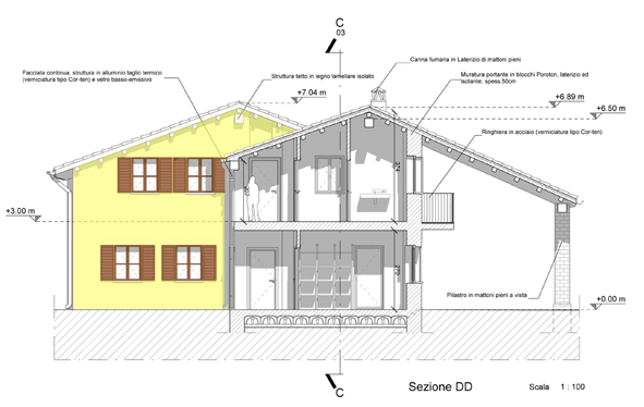 Mai come in questo caso il binomio vecchio e nuovo hanno trovato riscontro positivo andando ad utilizzare materiali semplici e tradizionali come la pietra (utilizzata per l'ampliamento e con alcuni inserti puntuali all'interno) con altri materiali più moderni e tecnologici come il rheinzink (lega zinco titanio) utilizzato per la copertura (posato con il sistema a graffatura) ed il legno lamellare